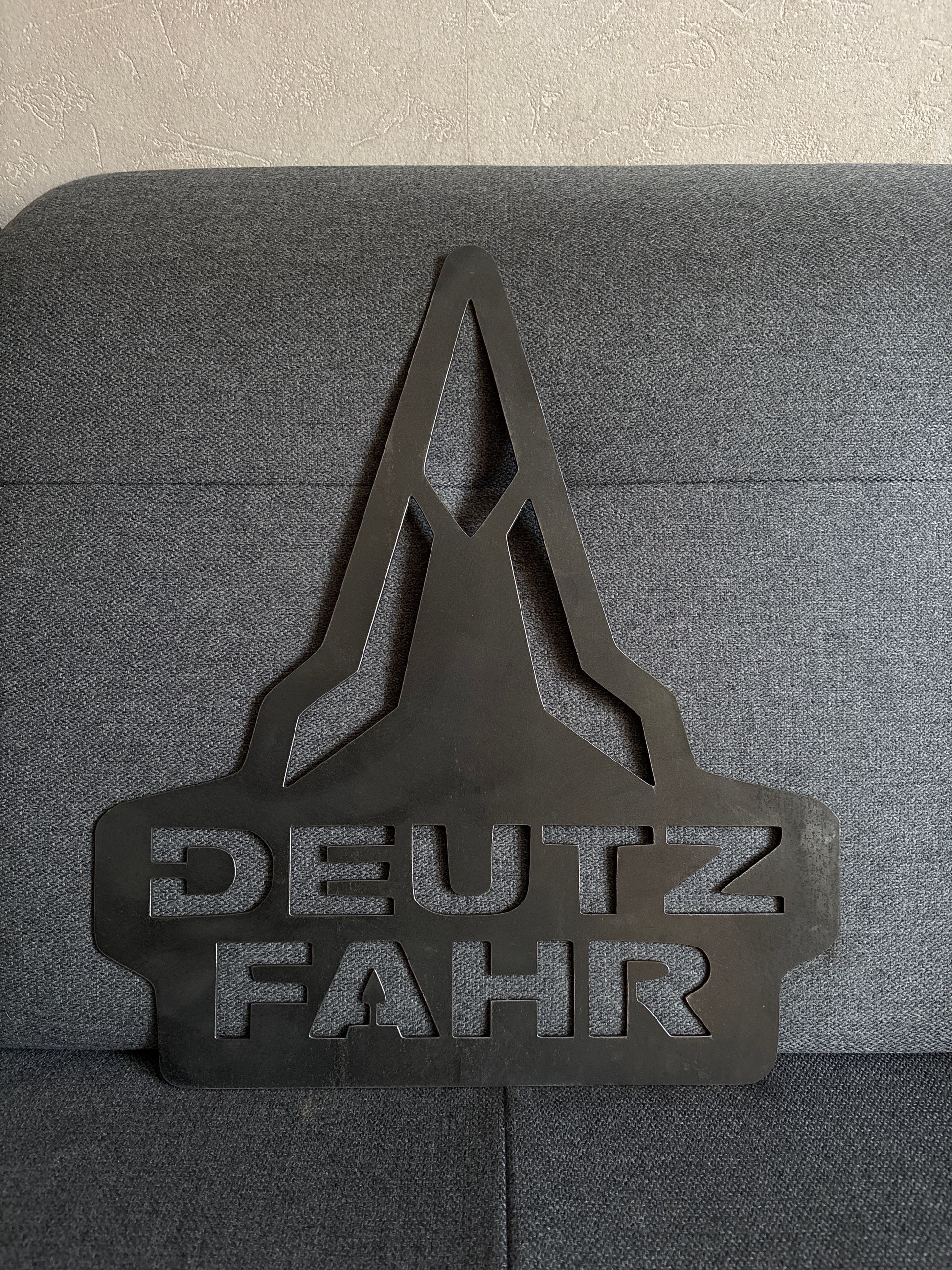 Apportez du caractère à votre espace avec ce logo DEUTZ en métal découpé. Son design triangulaire iconique avec le tracteur intégré affirme immédiatement votre passion